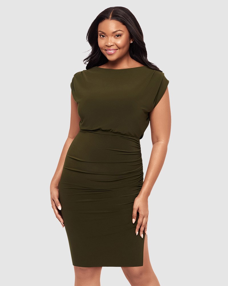 Elegant and sculpted, this softly-draped shapewear dress has a relaxed, blouse-style top section with cap sleeves which flows into a fitted bodycon skirt on the lower half. MiraMatte Jersey 360° shaping fabric smooths and cinches from the waist down, and it's finished with figure-enhancing shirred details plus a side slit for ease of movement.