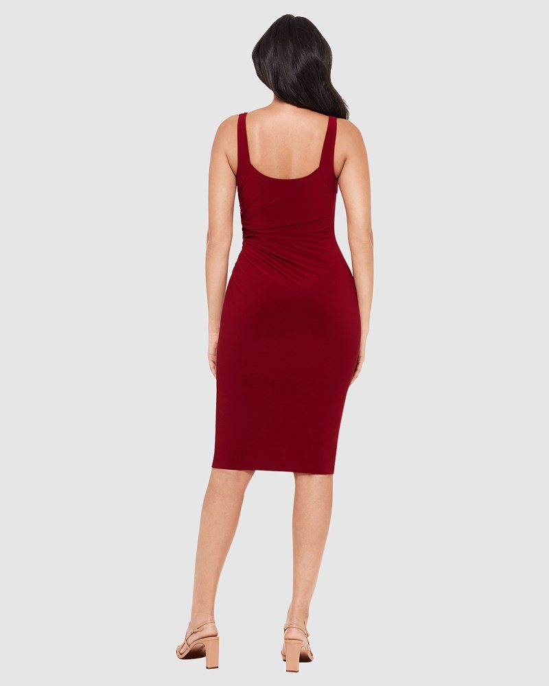 Look slimmer and smoother in seconds with this square neck midi dress, which has a secret shapewear layer built right in as well as a wirefree shelf bra so you can wear it with or without a separate bra. Strategically-placed shirring at the waistline creates an instant hourglass silhouette, and the Miramatte™ Jersey is soft, sleek, and never needs ironing.