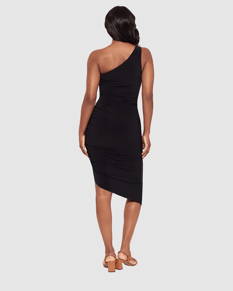 Perfectly balanced between effortless ease and curve-sculpting drama, this one shoulder, asymmetric hem dress is crafted from MiraMatte Jersey 360° shaping fabric that's shirred in all the right places for a cinched hourglass look the moment you slip it on. Design details include a mesh panel at the shoulder and a built-in shelf bra for fabulous bra-free support.
