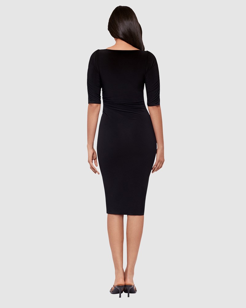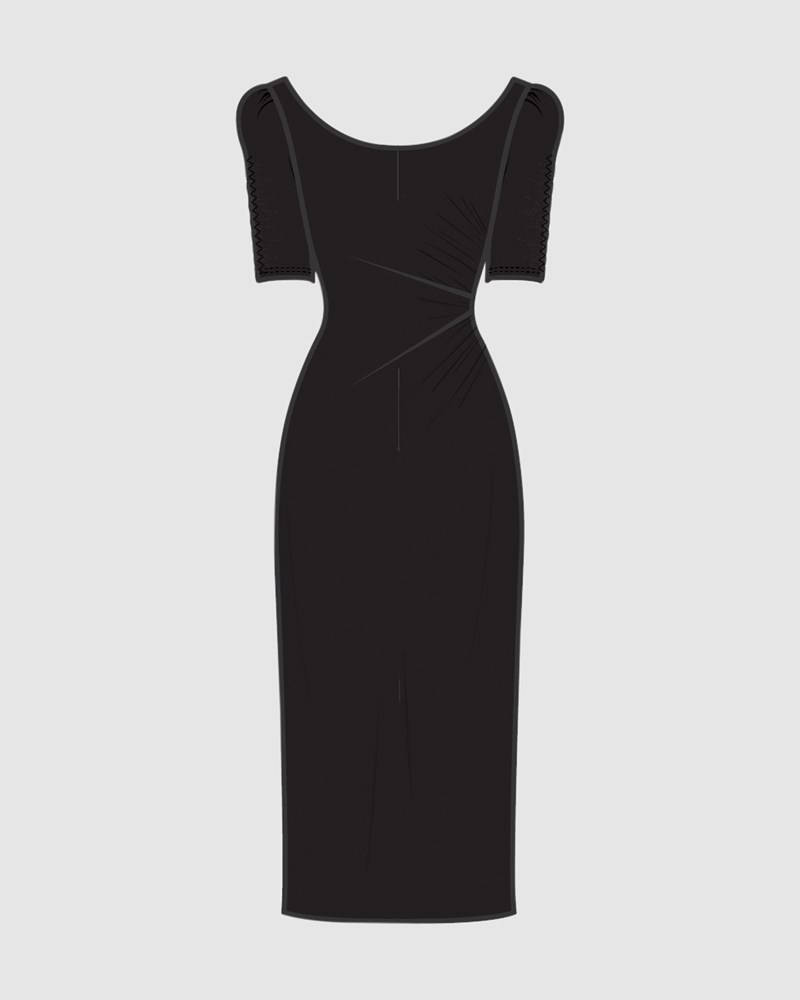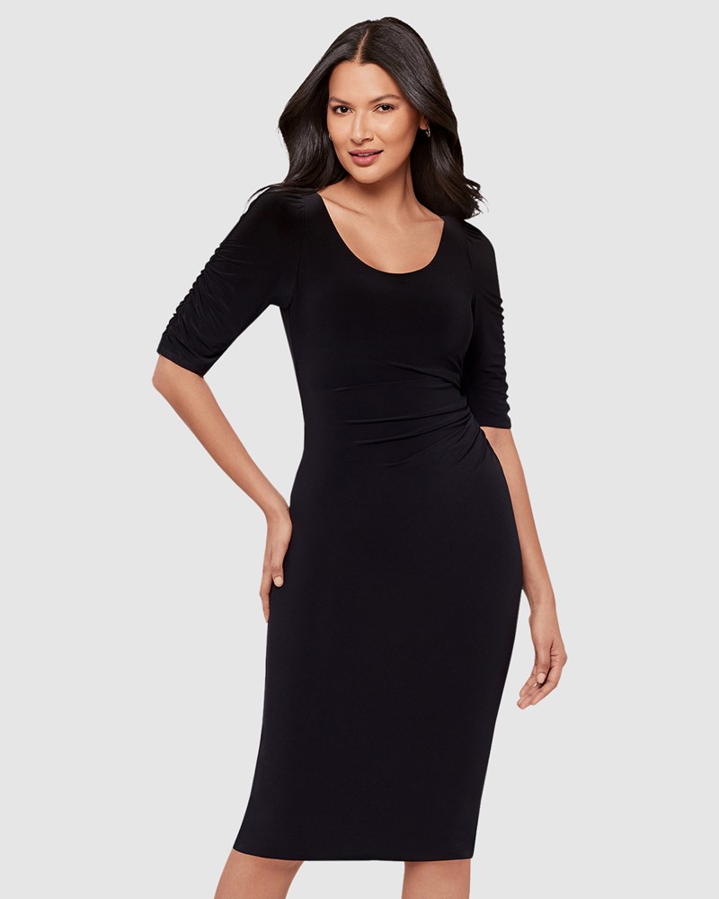 Whether you wear it to work or to a party, you'll always look fabulous with minimum effort in this knee-length shaping dress, which has a smooth, non-wrinkle Miramatte™ Jersey outer and a Miratex® 360° Shaping Net inner which delivers all-over sculpting and slimming. It also has a built-in shelf bra, plus above-elbow sleeves with shirred detailing and asymmetric waist shirring for an instant hourglass.