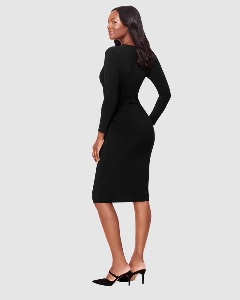 Strategically draped to flatter from every angle, this long sleeve bodycon dress is made from soft, non-wrinkle Miramatte™ Jersey with hidden Miratex® 360° Shaping Net to smooth your back, waist, tummy and thighs. Shirring subtly enhances your waistline, and is comes with a supportive built-in shelf bra (plus room for your own bra if preferred).