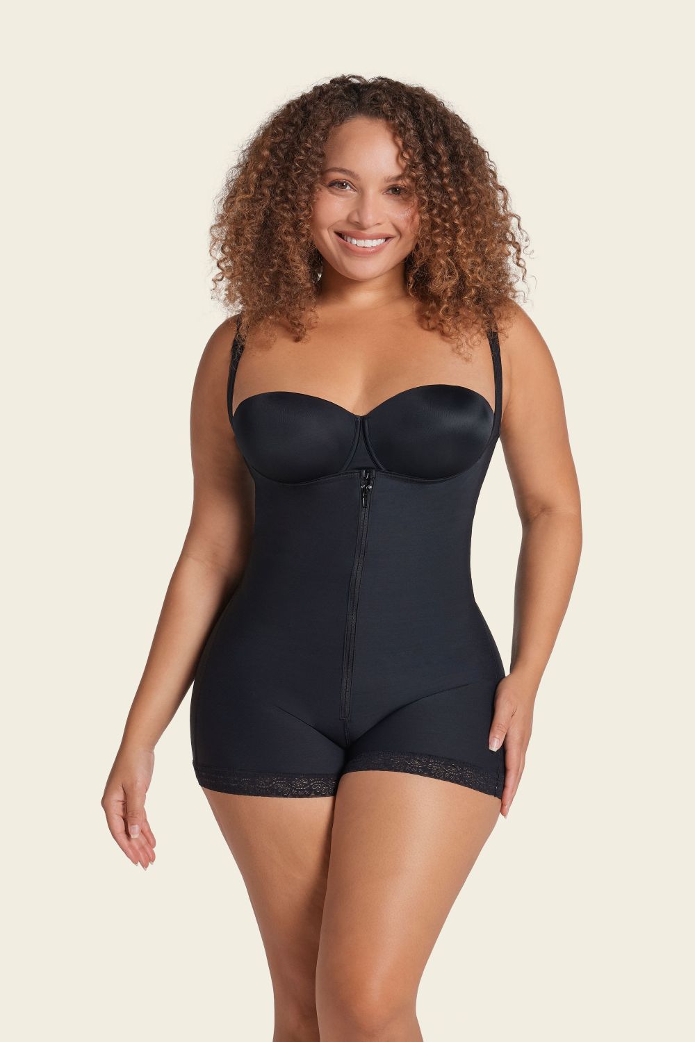 Get strong full-torso shaping (bra not included) that's easy to put on and comfortable to wear with this boyshort body shaper, which has a flat hook and zip front (not visible under clothing) backed by soft fabric and a soft microfibre lining throughout. Other features of this zip up shapewear design include adjustable and removable thermafused straps, rear microfibre cut-outs for a non-flattening and butt-lifting effect, and a lace legline trim with anti-slip lining to keep them in place.