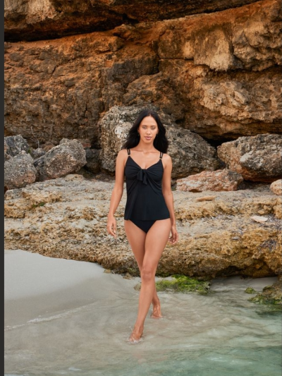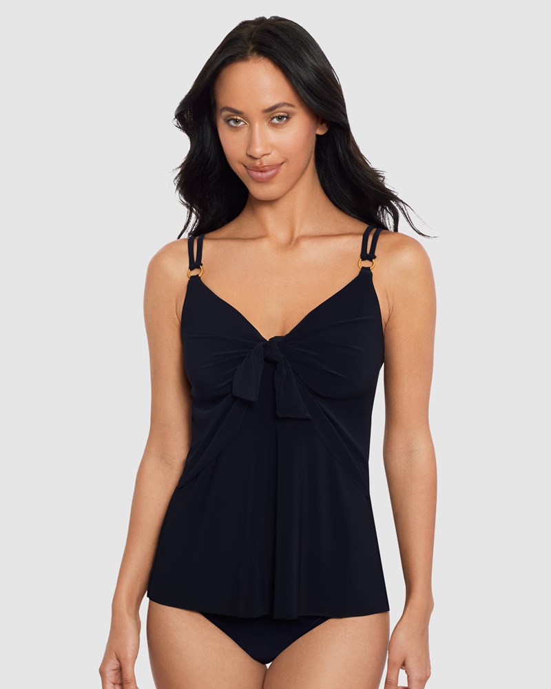 Designed for a comfortable, figure-flattering fit, this loose fit tankini top features a V-shaped neckline with a chic, bust-accentuating knot at the centre, connected by sleek ring hardware to split strap details on the shoulder. It's a wirefree tankini top with removable cup padding, for customisable support.