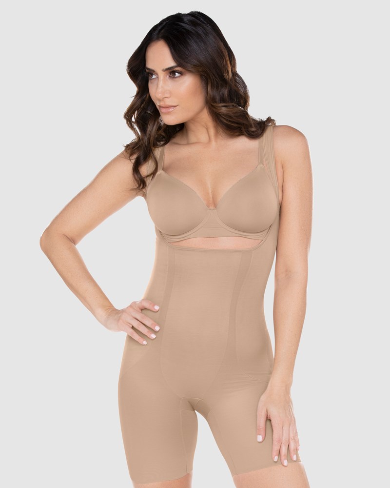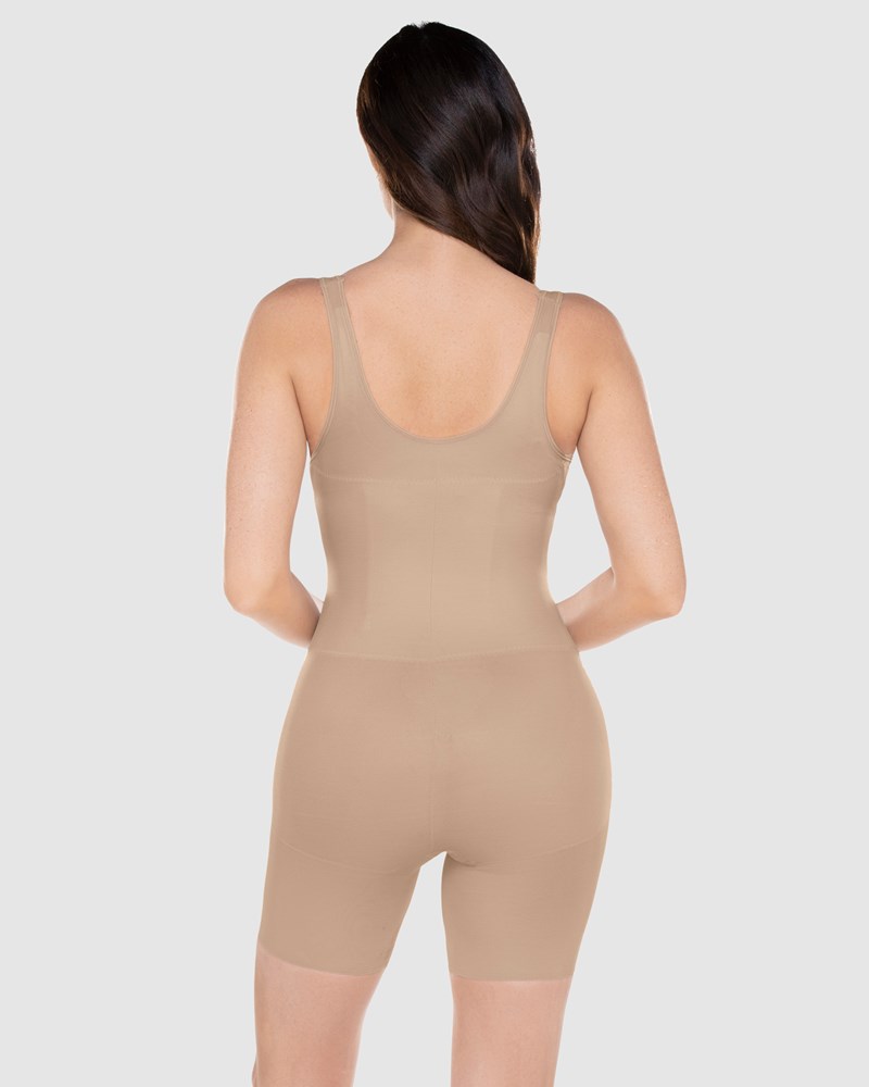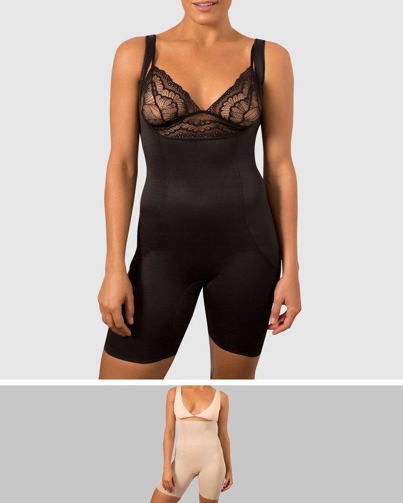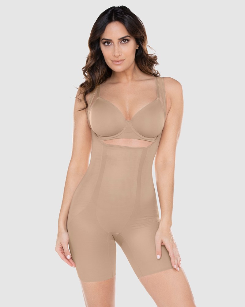 Shape away back fat and muffin top in true comfort with MiracleSuit's revolutionary Back Magic® technology. This shaper contours the torso using flexible stays, double panels, and our signature extra firm control design. Choose this torsette thigh slimmer to transform your back, midriff, tummy, waist, hips, & thighs.
