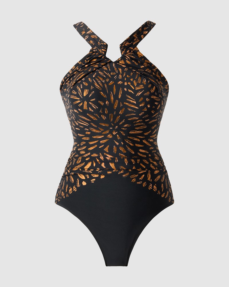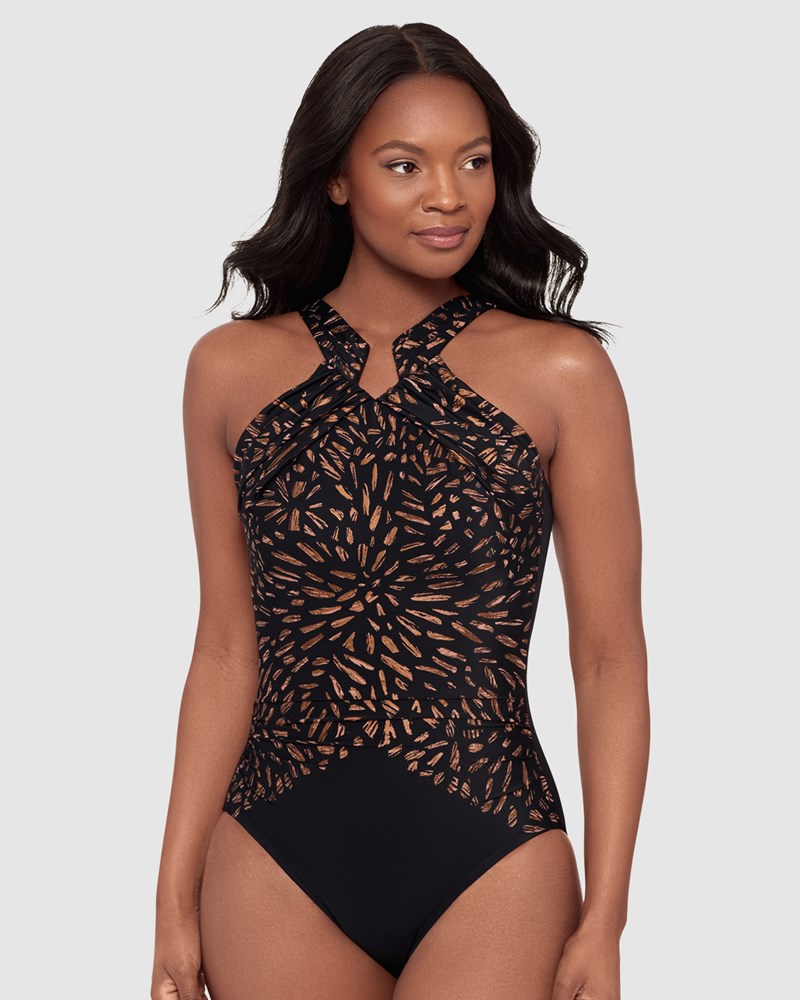 Flatter your tummy and waist in this elegant one-piece swimsuit. Designed by one of the world's leading shapewear brands, it's made from slimming and smoothing Miratex fabric®. The eye-catching high neck design resembles a halter, but has standard straps at the back so that no weight is getting put on your neck. Tummy-flattering ruching completes the look, for a bathing suit you'll feel truly beautiful in.