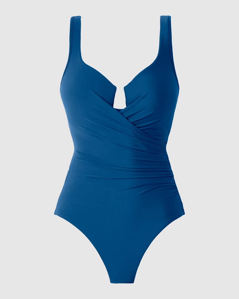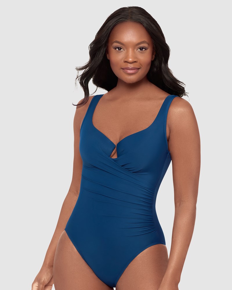 Step into this one-piece swimsuit and discover a slimmer, shapelier new you! Made from Miraclesuit's powerful Miratex fabric, it provides all-over control without relying on linings or shaping panels, for maximum smoothness with no added bulk. This slimming bathing suit also has underwired cups with moulded foam padding, which frame a stylish cut-out detail. It's finished with gathering that flares out from one side of the waist, to visually enhance the hourglass effect.