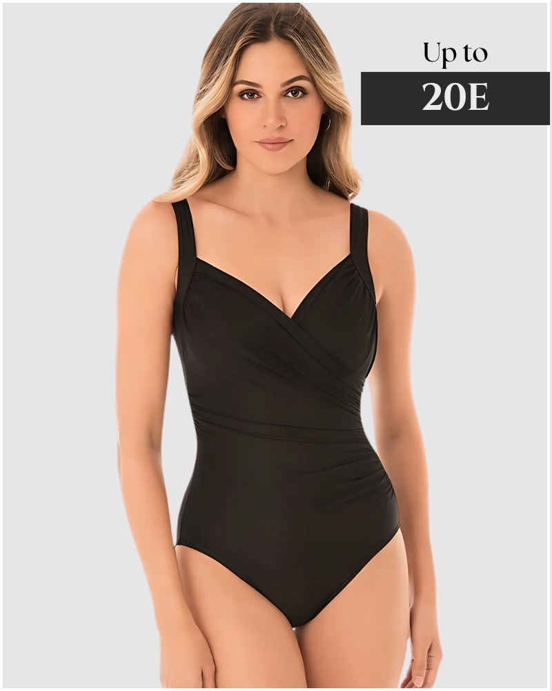 Feel fabulous at the beach in this one piece swimsuit with hidden underwire, and built-in shaping. Made from Miraclesuit's lightweight-yet-powerful Miratex fabric, it provides all-over smoothing and slimming. Cleverly-placed ruching fans out from one side, tricking the eye into seeing a more hourglass-y silhouette. The crossover design creates a sweetheart neckline, which is framed by wide shoulder straps.