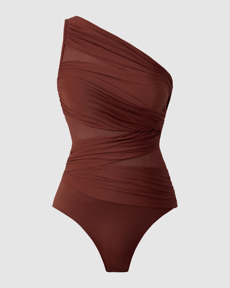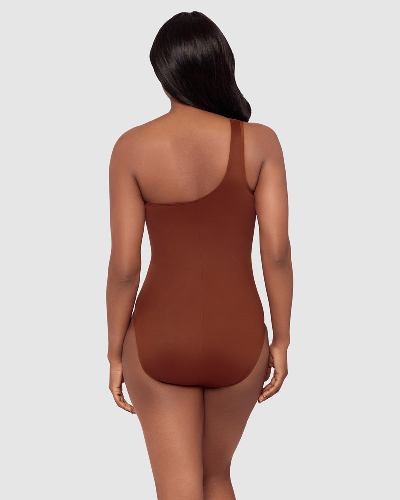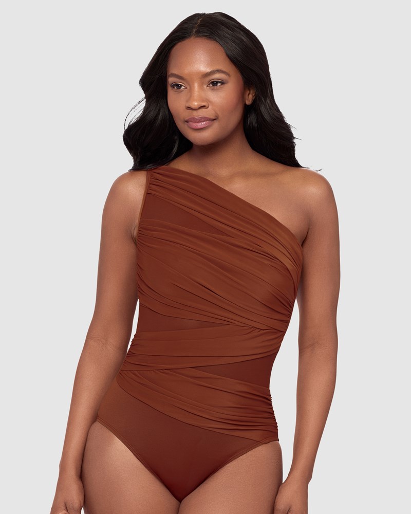 Sophisticated styling meets flattering shaping in this asymmetric swimsuit design, which dramatically slims your figure through a combination of shapewear-effect fabric and illusion draping and panelling. Ruched fabric criss-crosses over a mesh background, revealing hints of sheerness, while the solid back creates a slender-looking figure from every angle.