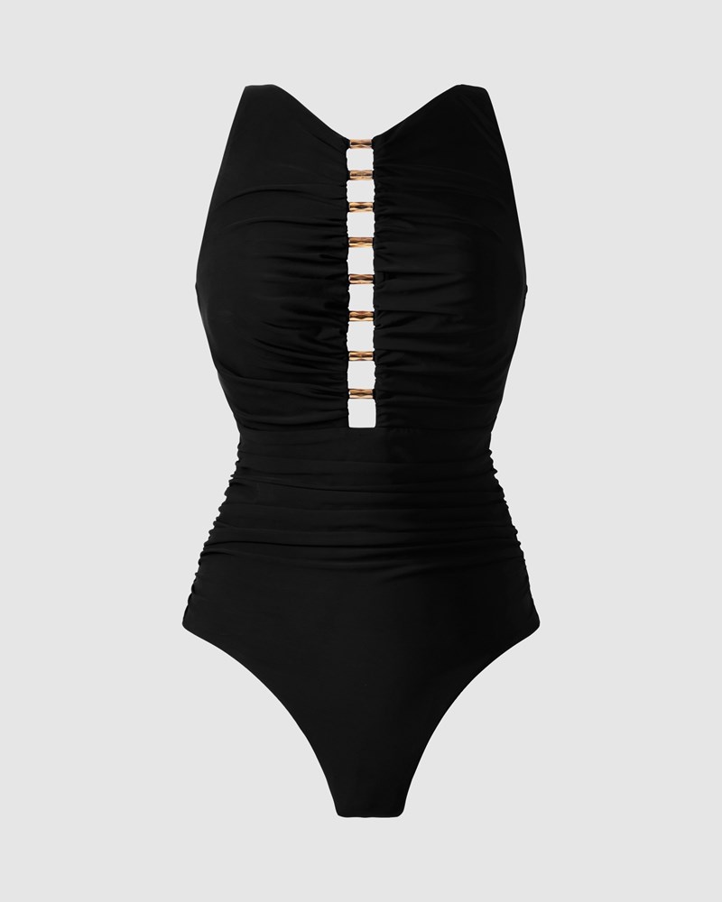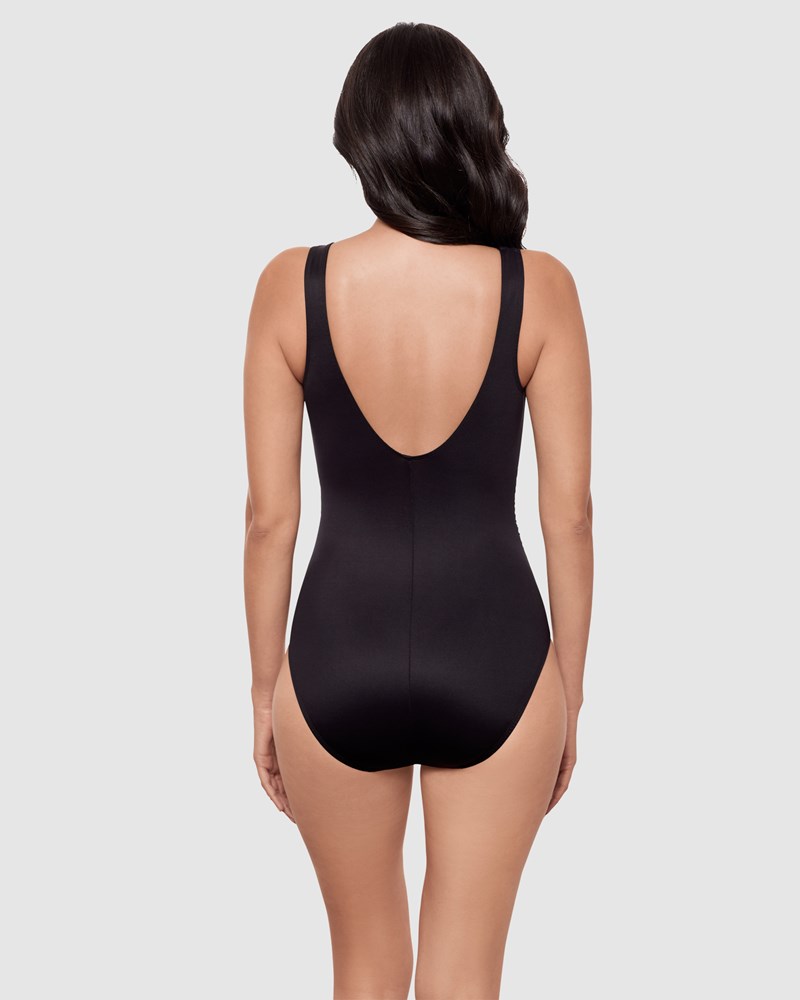 The perfect blend of slimming coverage and stylish details, this high neck swimsuit features a deep plunge front held securely in place by golden bead accents. Made from sculpting Miratex fabric and with expertly placed shirring and hidden underwire support to enhance your curves.