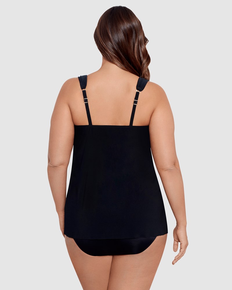 Make waves in this stylish plus size tankini with a built-in bra, which supports your bust via hidden underwire while cleverly concealing your tummy with its chic draped front. Coordinating hardware on the straps adds a touch of luxe, and they're adjustable in length to guarantee a perfect fit.