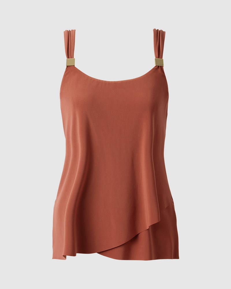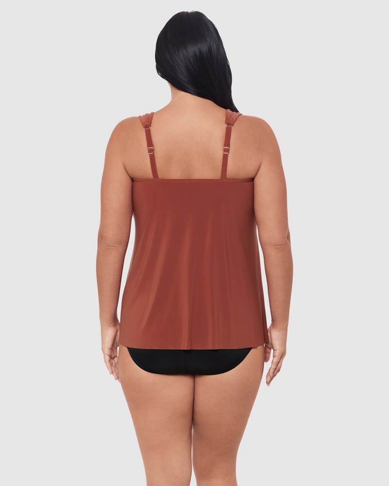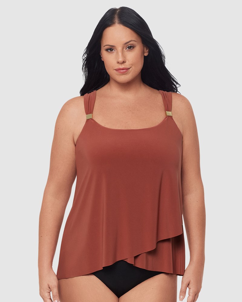 Make waves in this stylish plus size tankini with a built-in bra, which supports your bust via hidden underwire while cleverly concealing your tummy with its chic draped front. Coordinating hardware on the straps adds a touch of luxe, and they're adjustable in length to guarantee a perfect fit.