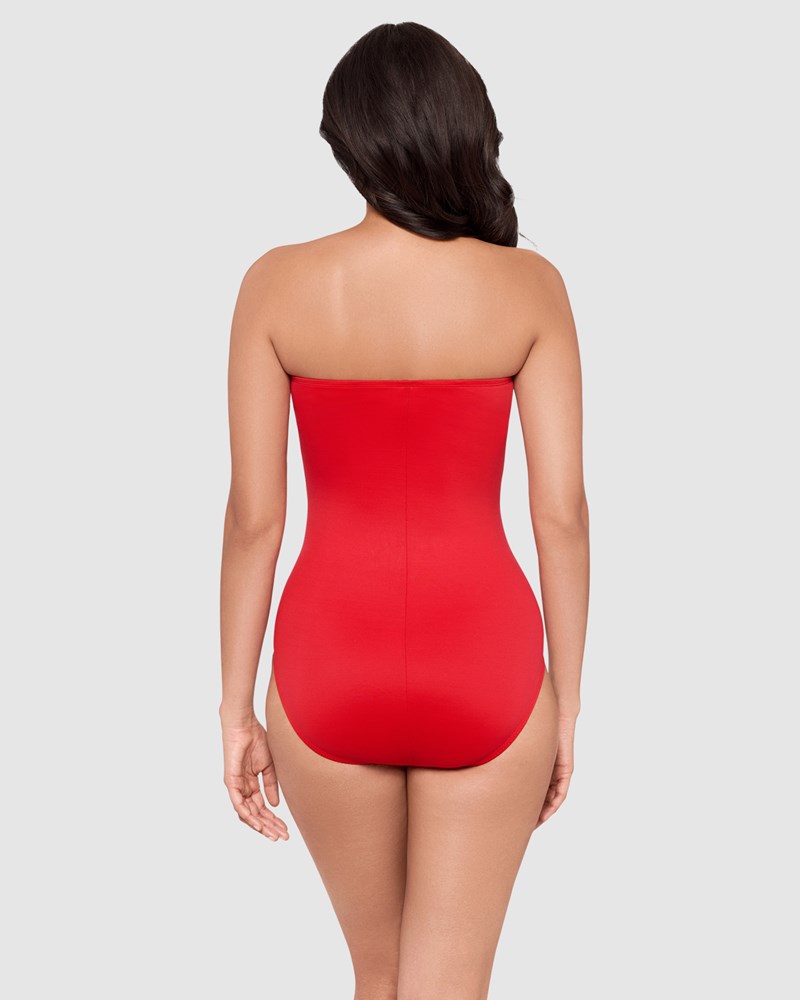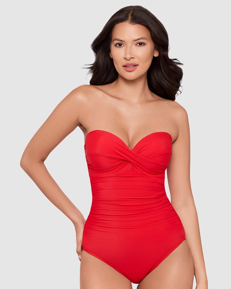 This one-piece swimsuit with detachable straps is the perfect way to enjoy both tan line-free shoulders and a smoother tummy! It's a slimming control swimsuit made using Miraclesuit's powerful Miratex fabric, which slenderises without feeling constraining. Subtle draping across the tummy also helps to flatter your natural curves. Chic crossover detail at the neckline highlights your bust, which is lifted and supported by hidden underwires and foam cup padding.