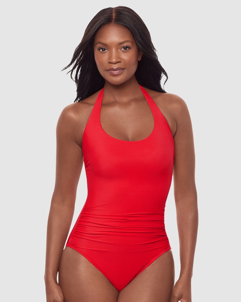 Get smooth, sleek, hourglass curves in this minimalist halter neck swimsuit, made with Miratex® fabric that delivers 3x the shaping power of regular swimwear fabrics without any need for bulky or uncomfortable linings. This halter tie swimsuit also lifts your bust thanks to hidden underwire and has gentle draping to subtly flatter your tummy.