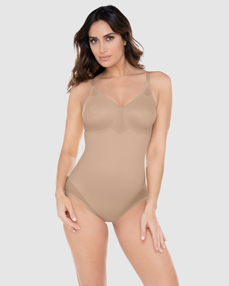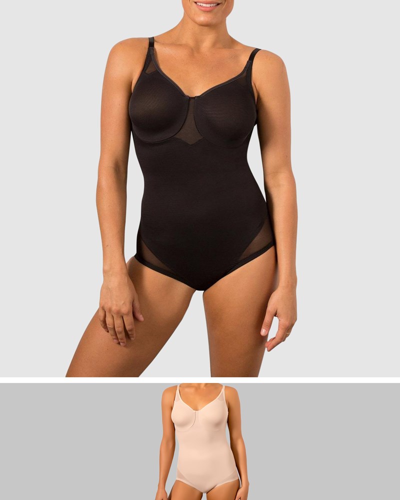This underwire body briefer from MiracleSuit features sexy, sheer paneling which allows the garment to adjust to your body and create a perfect fit. The double panels provide extra firm control and shaping but maintain a smooth look under your clothes. Choose it to support your bust, shape your midriff, and slim your tummy & hips.