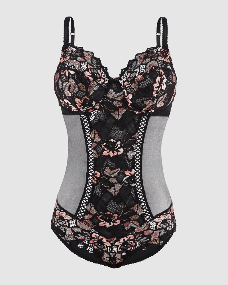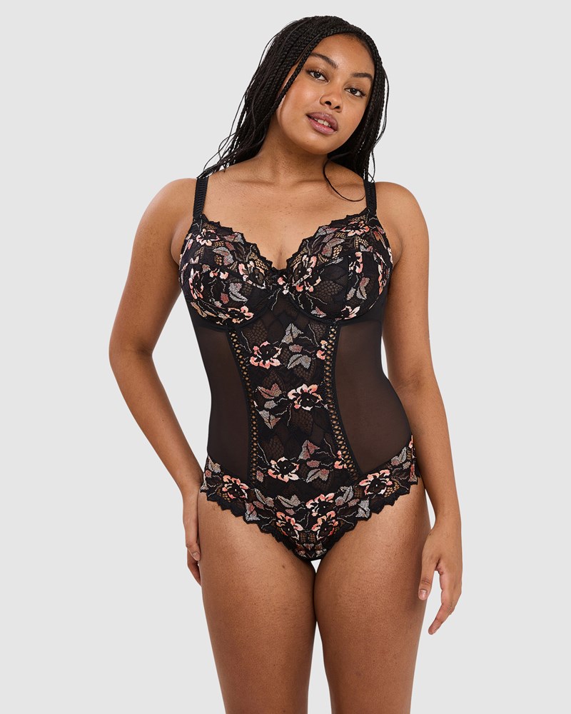 Get a sculpted, supported silhouette the elegant way with this lace and mesh lingerie bodysuit. Based on the brand's bestselling Arum bra, it's an underwired bodysuit with 3-part cups for lots of lift, with the collection's signature leafy-edged lace continuing down the center panel and around the hips. Mesh sides provide breathability throughout the warmer months and also offers a slimming look, while the back is made from super soft microfiber with a chic keyhole detail.