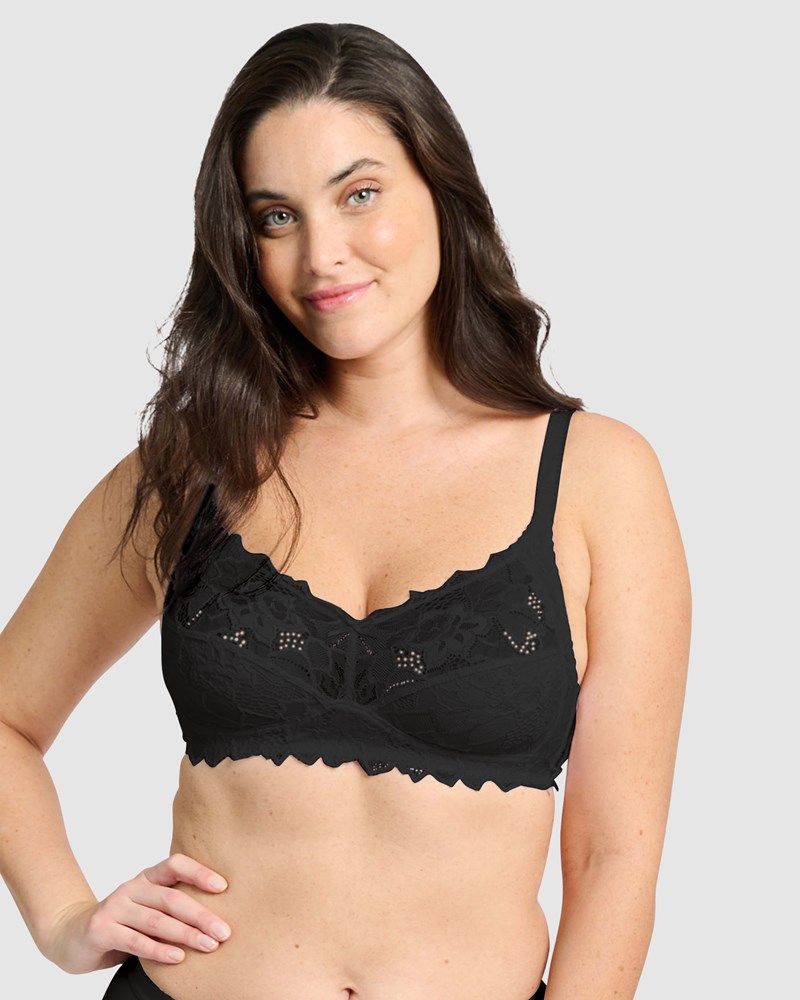 Treat your skin to unbeatable softness with this pretty but comfortable bra, made from a blend of organic cotton and stretchy floral lace. It's a wireless bra with side support for better shaping, and features beautiful scalloped edges along the tops of the cups and the front of the band.